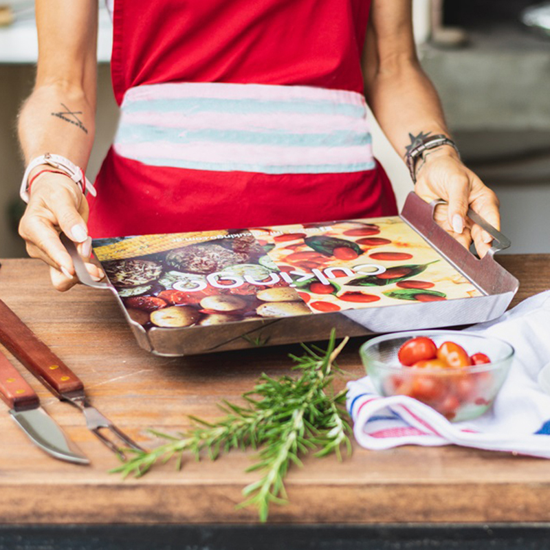Las líneas ergonómicas de sus asas permiten un agarre cómodo y firme. Es apta para usar sobre cualquier tipo de parrilla, a leña, carbón, gas o eléctrica. Está fabricada en una sola pieza de acero inoxidable de alta calidad.