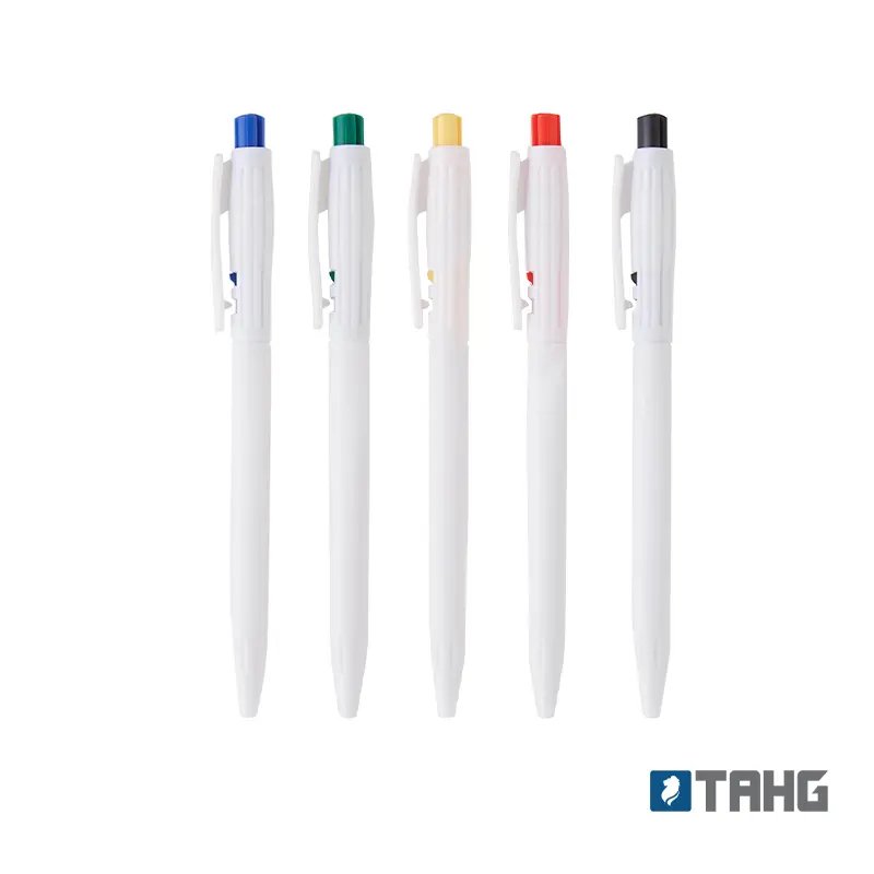 Bolígrafo confeccionado en ABS, de cuerpo de color blanco y clip en color. Apertura con pulsador. Tinta Azul. Tahg