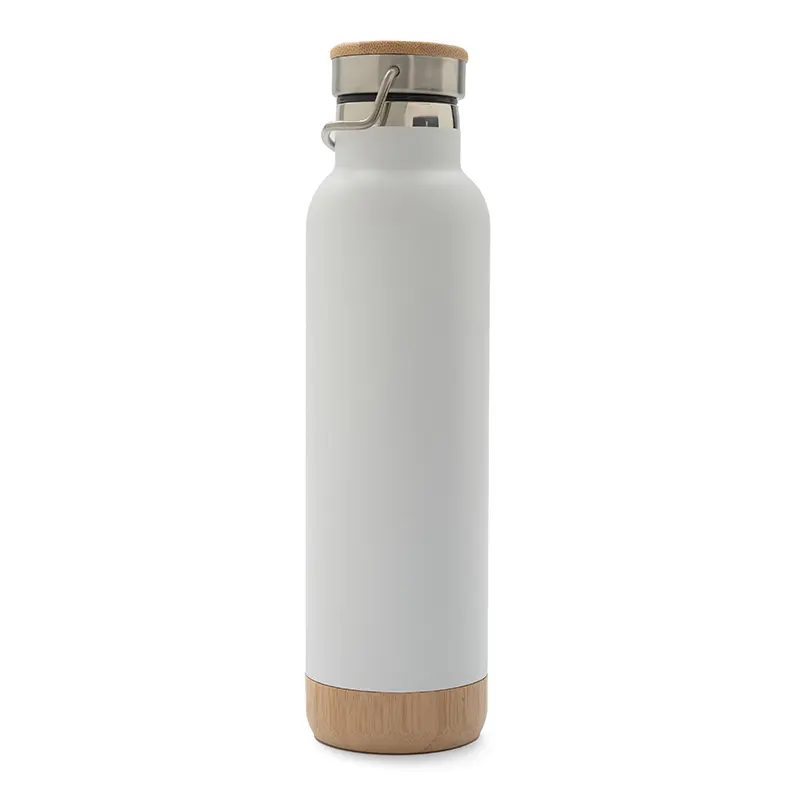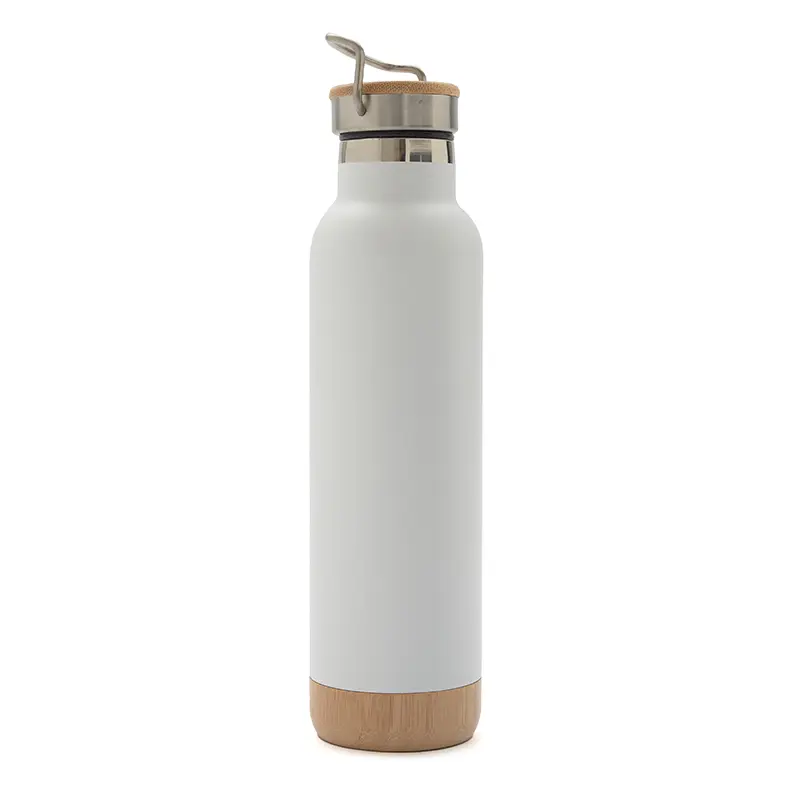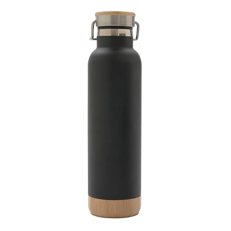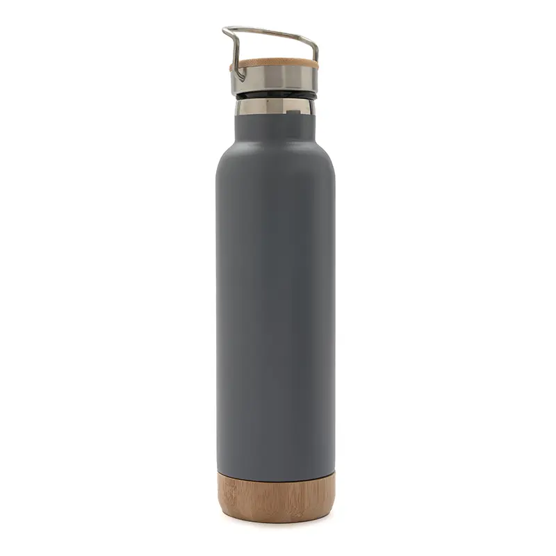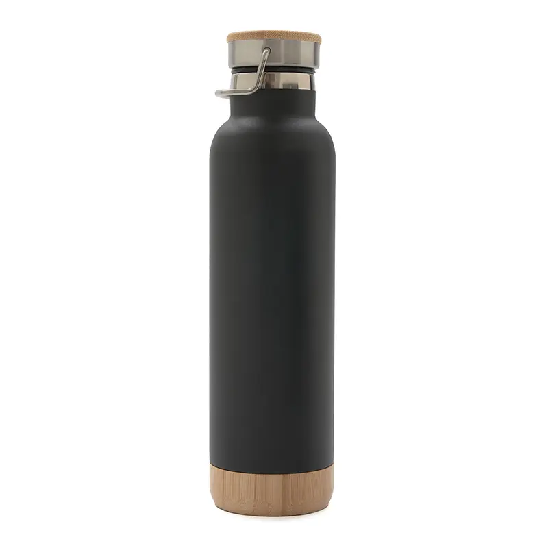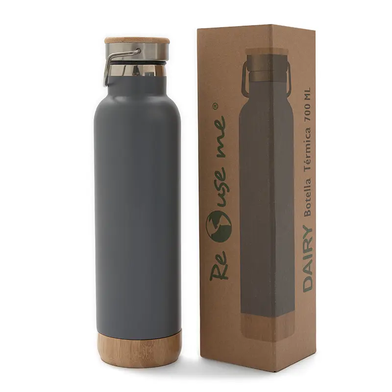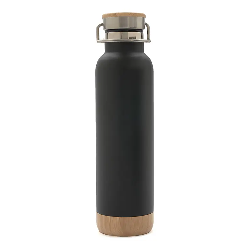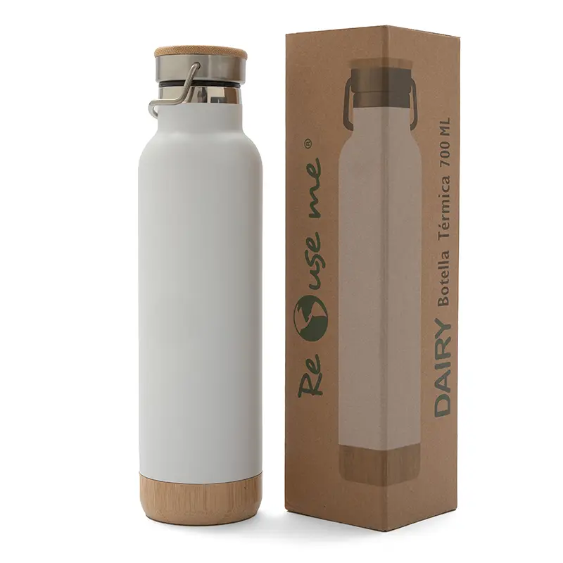 Botella reutilizable de 700 ml de doble pared de acero inoxidable 304, con base de bamboo. Mantiene las bebidas frías por 24 horas y calientes durante 12 horas. Cuenta con tapa a rosca de bamboo y gancho para facilitar su agarre.