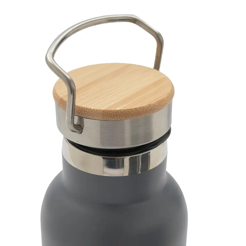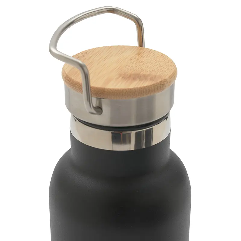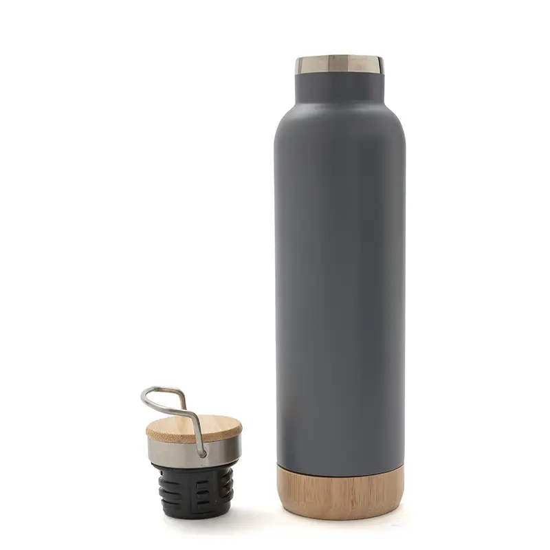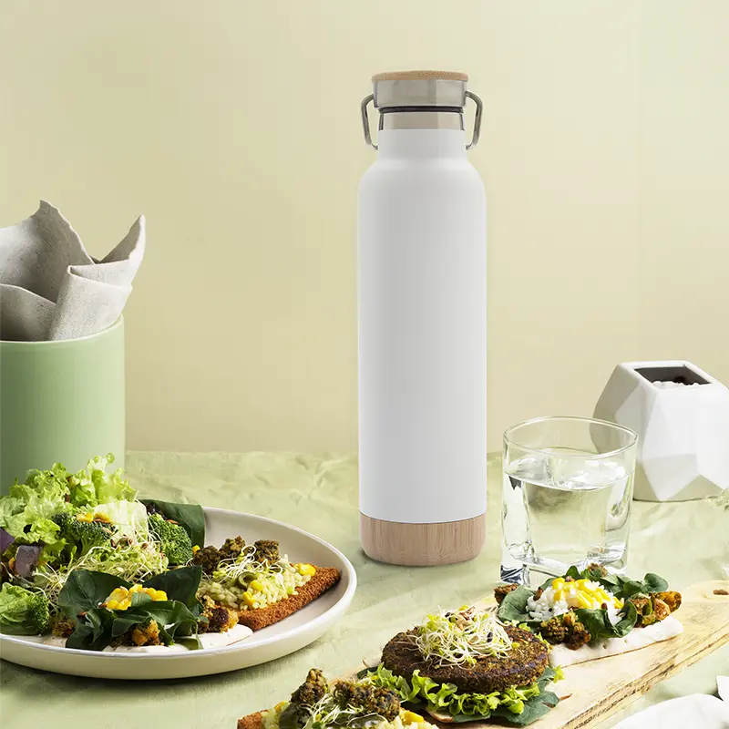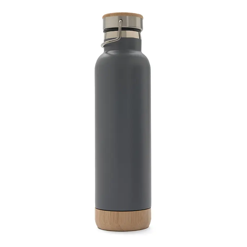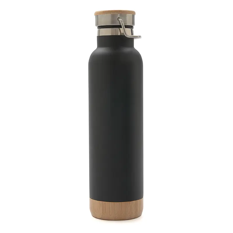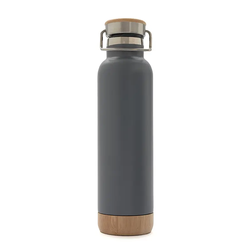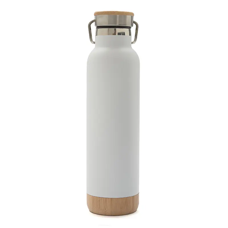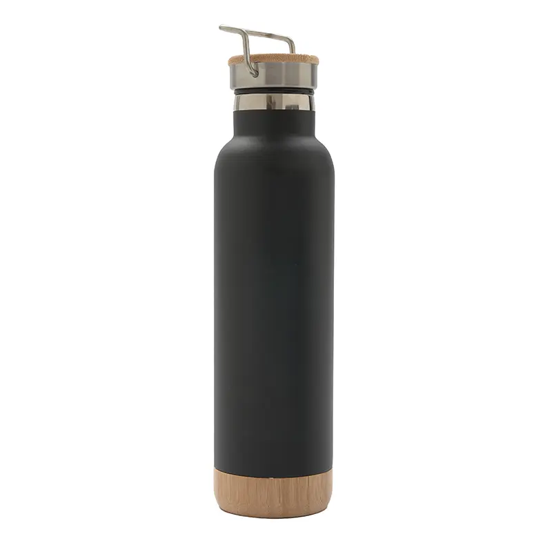 Botella reutilizable de 700 ml de doble pared de acero inoxidable 304, con base de bamboo. Mantiene las bebidas frías por 24 horas y calientes durante 12 horas. Cuenta con tapa a rosca de bamboo y gancho para facilitar su agarre.