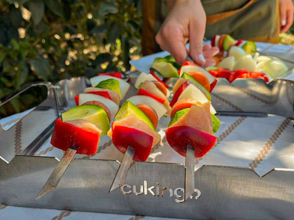 Con la brochetera vas a poder realizar la combinación de alimentos que más te guste dándoles un sabor y cocción únicos. Su diseño permite colocar las lanzas en cuatro posiciones diferentes para obtener una cocción perfecta. Podes crear tu combinación de carnes rojas, blancas, achuras, pescados, vegetales y hasta frutas. Es el complemento ideal para revolucionar tus parrilladas. Se puede utilizar sobre cualquier tipo de parrilla o incluso en hornos de barro.