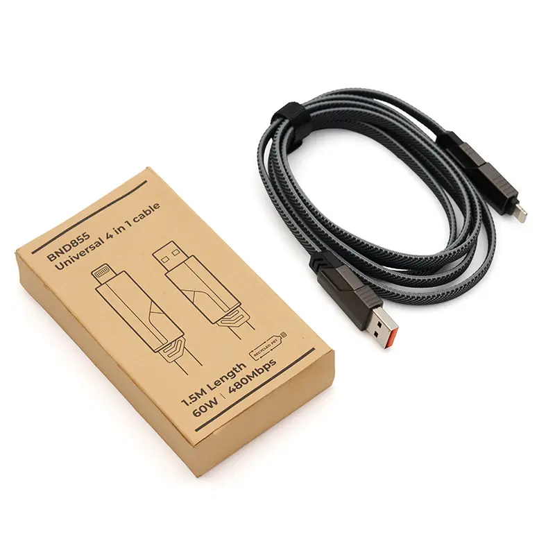 Cable universal de carga 4 en 1 fabricado en PET reciclado. Hecho de materiales sostenibles como RPET con terminaciones en titanio metálico, cuenta con conectores USB-A, USB-C, Lightning y USB-C en ambos extremos, además de correa de nailon para facilitar su organización. Es ideal para cargar una amplia variedad de dispositivos como smartphones, tablets y otros equipos electrónicos, garantizando eficiencia energética y alta velocidad gracias a su capacidad de carga de hasta 60 W y transferencia de datos de hasta 480 Mbps.
