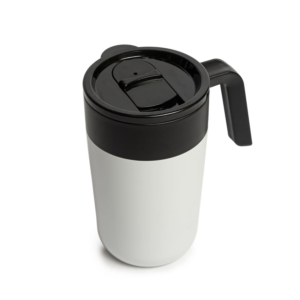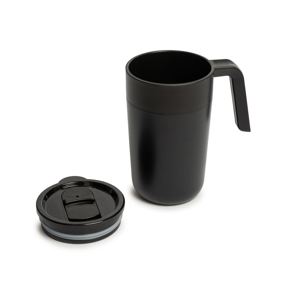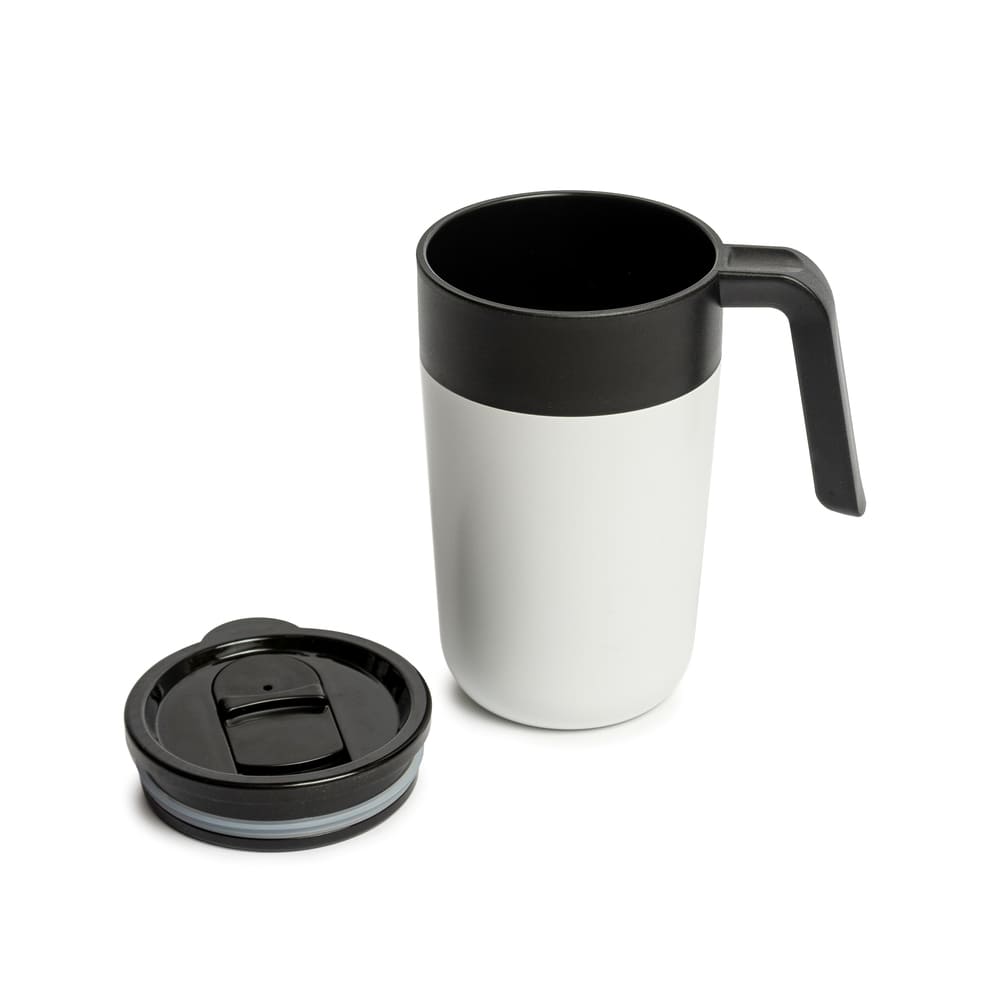 Mug doble pared. Interior de polipropileno y exterior de acero 201, acabado mate. Asa y tapa de polipropileno con anillo de silicona y seguro antiderrame. Base antideslizante. Caja contenedora de cartón blanco.