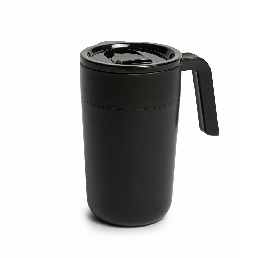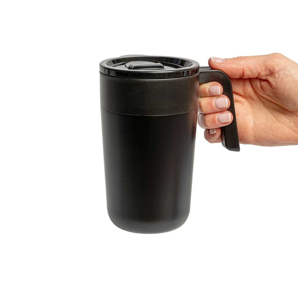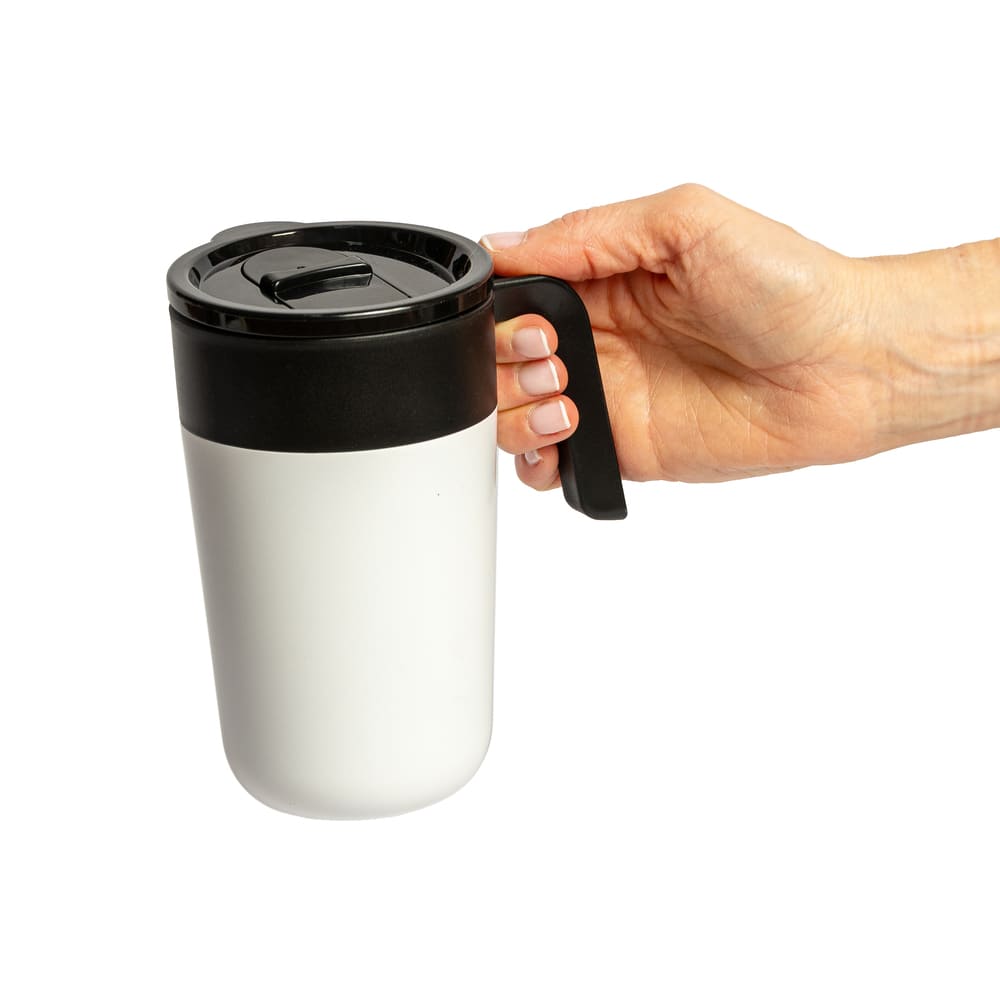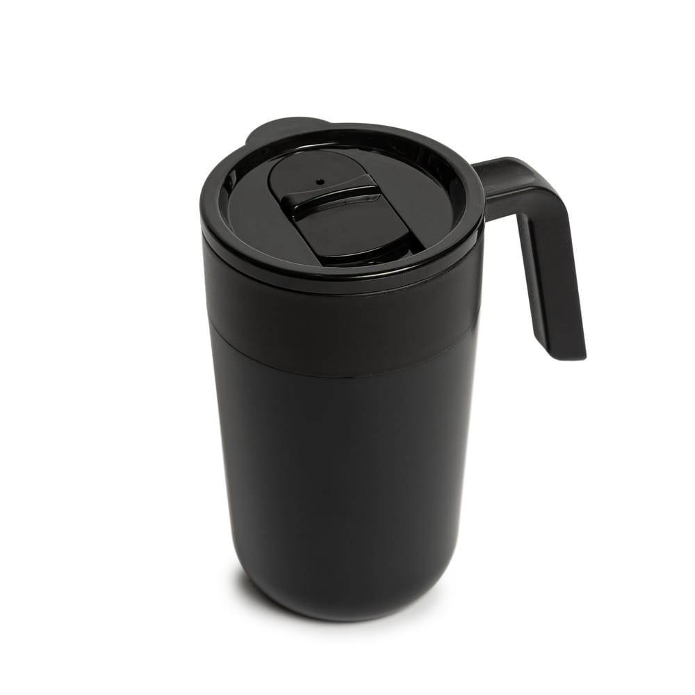 Mug doble pared. Interior de polipropileno y exterior de acero 201, acabado mate. Asa y tapa de polipropileno con anillo de silicona y seguro antiderrame. Base antideslizante. Caja contenedora de cartón blanco.