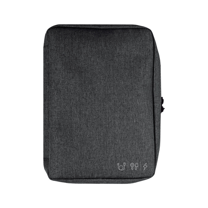 Poliéster. 19 x 26 x 5 cm. Organizador para cables y accesorios. Cuenta con dos bolsillos de red con cierre. 4 elásticos que permiten enrollar y guardar los cables, 1 elástico porta bolígrafo y 2 elásticos amplios. NO INCLUYE ACCESORIOS.