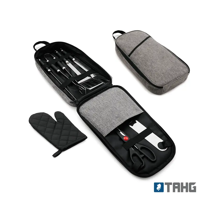 El Set BBQ Fuego es ideal para tus parrilladas y asados. Contiene: tenedor, pinza, espátula, afilador, tijera, guante y destapador abridor de cervezas. Viene presentado en un estuche de poliéster de alta calidad, perfecto para almacenar y transportar tus utensilios. Tahg